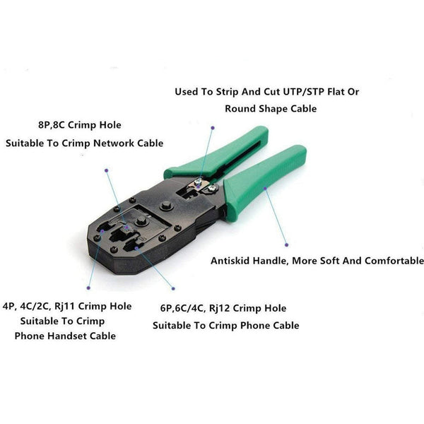 The Network Cable Tester and Repair Tool Kit is a must-have for professionals and DIYers working with network cables. This Network Cable Tester and Repair Tool Kit includes three crimping pliers for 4P, 6P, and 8P connectors, designed with hardened dies to ensure secure crimps without damage. The kit features a fast, automatic scanning tester in a compact design, making the Network Cable Tester and Repair Tool Kit ideal for quick diagnostics.