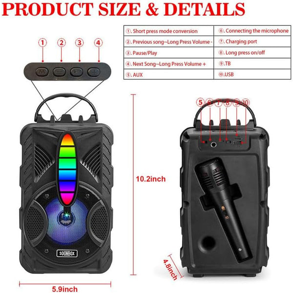 Take the party anywhere with the Rechargeable Wireless Speaker with Microphone – RGB lights, booming sound, and total portability in one sleek package.