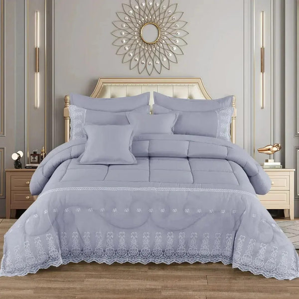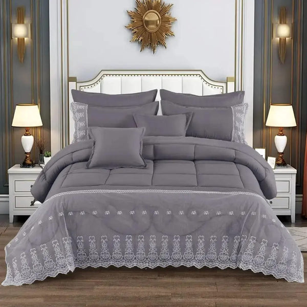 Elevate your bedroom with the timeless charm of the 7 Piece Comforter Set with Lace Trim, thoughtfully designed to offer both style and comfort. The centrepiece is a generously sized comforter (230 x 200 cm), adorned with delicate lace detailing that adds a touch of sophistication to any décor.
