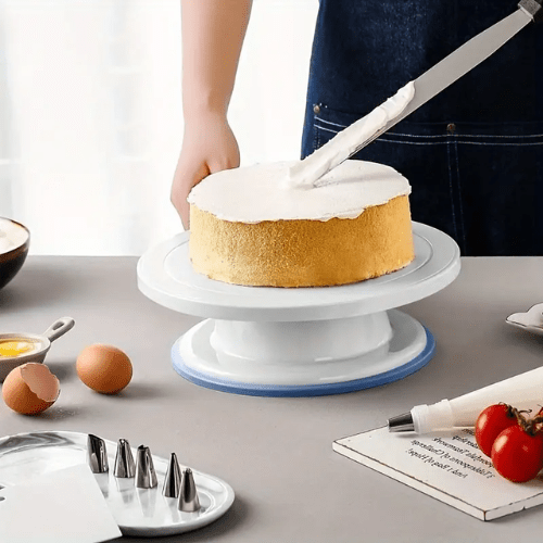 - Multi-Purpose Cake Stand – Perfect for applying icing, piping borders, leveling layers, and creating intricate decorations with precision.