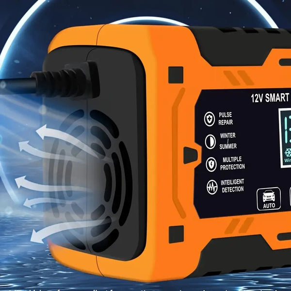 The 12V 6A Auto Pulse Repair Charger is a smart and versatile charger designed to work with all types of 12V batteries, including lead-acid, AGM, and gel batteries. Featuring an easy-to-read digital LCD display, the 12V 6A Auto Pulse Repair Charger provides real-time updates on voltage, temperature, and charging status. Equipped with multiple safety protections such as overcharge, overheat, short circuit, and reverse polarity protection, the 12V 6A Auto Pulse Repair Charger ensures safe and reliable operation. Its ergonomic and compact design makes the 12V 6A Auto Pulse Repair Charger highly portable and easy to use for cars, motorcycles, boats, and other 12V battery-powered devices. Built with a durable flame-retardant ABS shell, the 12V 6A Auto Pulse Repair Charger offers excellent safety and longevity while available in stylish black and orange colours.