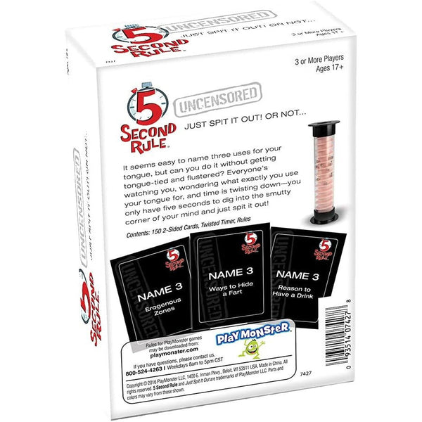 Challenge your quick-thinking skills with the 5 Second Rule Uncensored – Adult Party Game, a hilarious and fast-paced card game that guarantees laughter and excitement. Players must name three items in just five seconds—or face the consequences! The 5 Second Rule Uncensored – Adult Party Game adds a daring twist to the classic game with uncensored content for adults, making it perfect for parties, game nights, and social gatherings. Designed for multiple players and endless rounds of fun, the 5 Second Rule Uncensored – Adult Party Game keeps everyone on their toes while encouraging fast thinking and hilarious moments. Compact and easy to set up, the 5 Second Rule Uncensored – Adult Party Game is a must-have addition to any adult game collection. Bring home the 5 Second Rule Uncensored – Adult Party Game and make your next party unforgettable.