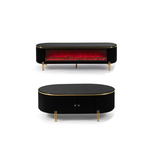 The TV stand (180 × 40 cm) includes a built-in LED fireplace display, purely for decorative purposes, creating a warm and inviting ambiance while enhancing style. The coffee table (130 × 70 cm) features a sleek oval design with practical storage, balancing aesthetics with functionality. Whether hosting guests or enjoying quiet evenings, the PrimeNest - Luna Stylish TV Stand & Coffee Table Set elevates your space into a modern retreat of style and practicality. This set is perfect for those who appreciate contemporary luxury with functional design.