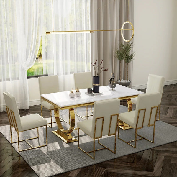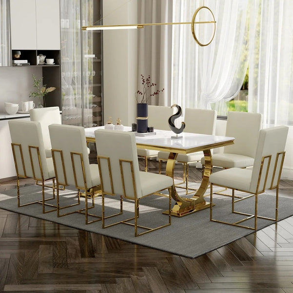 Enhance your home with the PrimeNest – Thea Modern Dining Table, a modern rectangular table with a polished marble top and smooth edges for a refined, sophisticated look. The PrimeNest – Thea Modern Dining Table features a U-shaped stainless steel base with a gold mirrored finish, adding a touch of luxury to any dining space. Designed to comfortably seat 6–8 people, the PrimeNest – Thea Modern Dining Table is perfect for family meals, entertaining guests, or casual dining in kitchens, dining rooms, or living rooms. With durable construction and elegant design, the PrimeNest – Thea Modern Dining Table combines style, functionality, and lasting quality. Complete your modern interior with the PrimeNest – Thea Modern Dining Table, a statement piece that enhances both aesthetics and practicality.